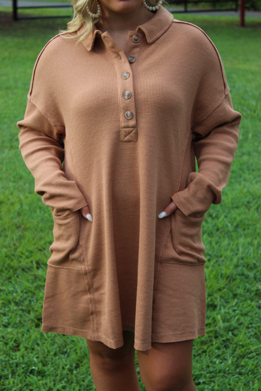 Casual Collared Henley Mini Dress - Camel