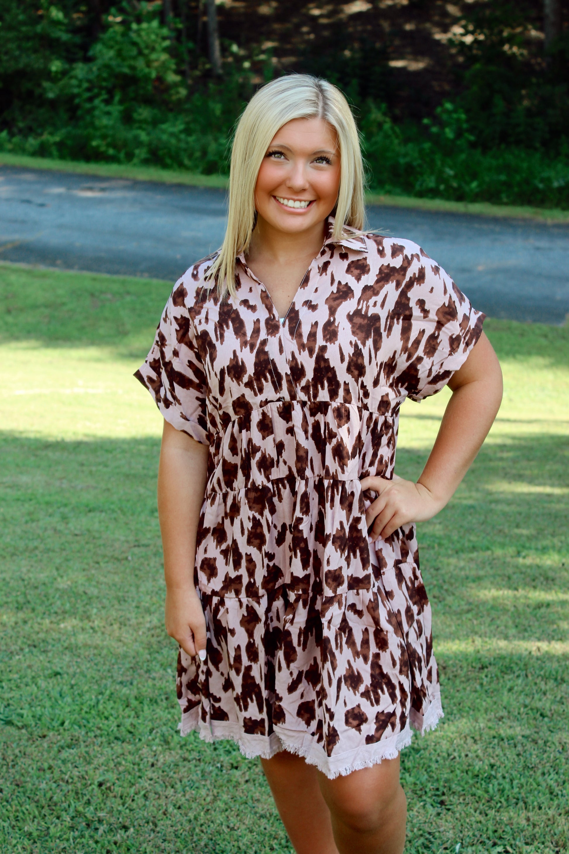 This pink tiered dress features a trendy animal print, sophisticated collared split neck, and frayed hem. The tiered design creates a flattering silhouette, making it a versatile and stylish addition to your wardrobe. Elevate your look with this chic and on-trend dress.