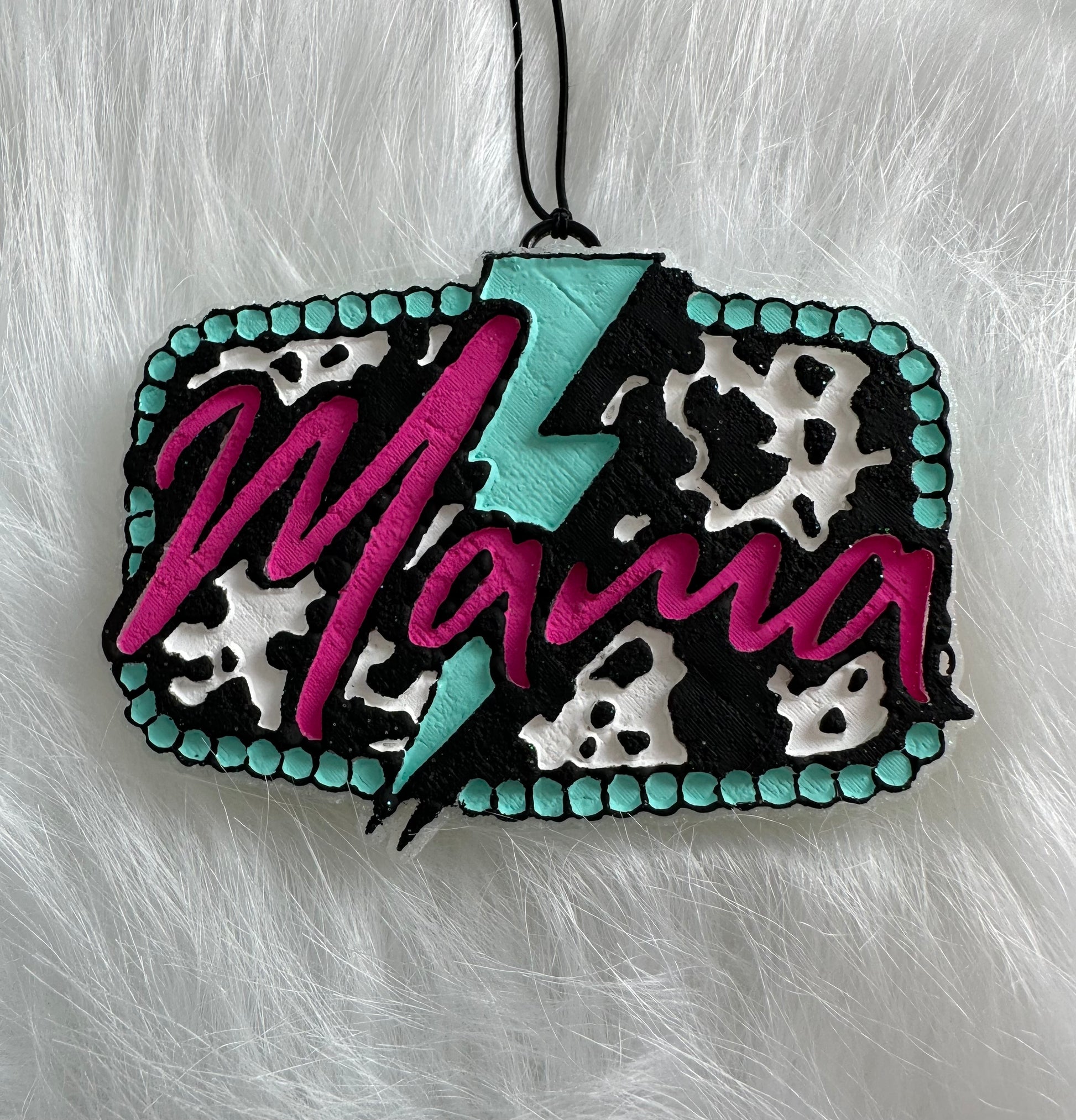 The Buckle Mama Freshie is a stylish and eye-catching accessory, featuring a striking turquoise lightning bolt and the word "mama" in vibrant hot pink. Its western-inspired design adds a unique touch and captivating charm to your rear view mirror!