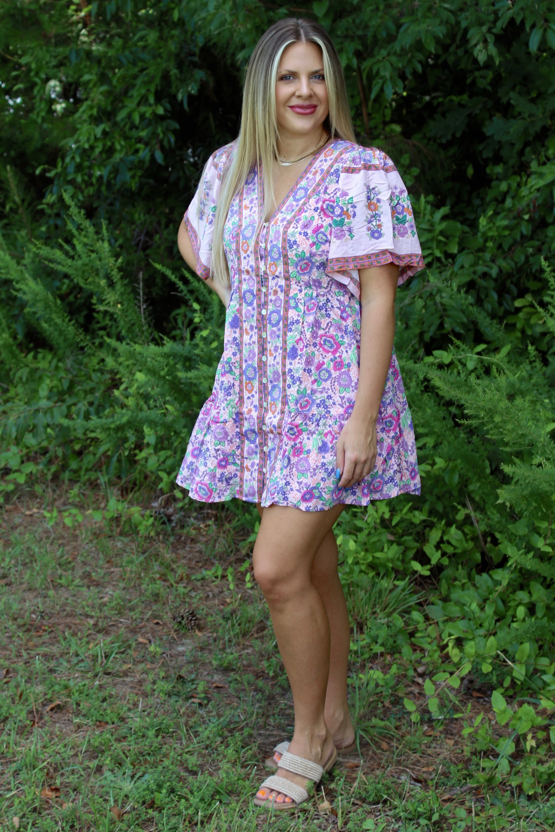 The "Feelin' Bohemian Woven Mini Dress" offers a charming option for brunch dates or date nights. Its features include a button-down design, short flyaway sleeves, a v-neck, and it’s lined!