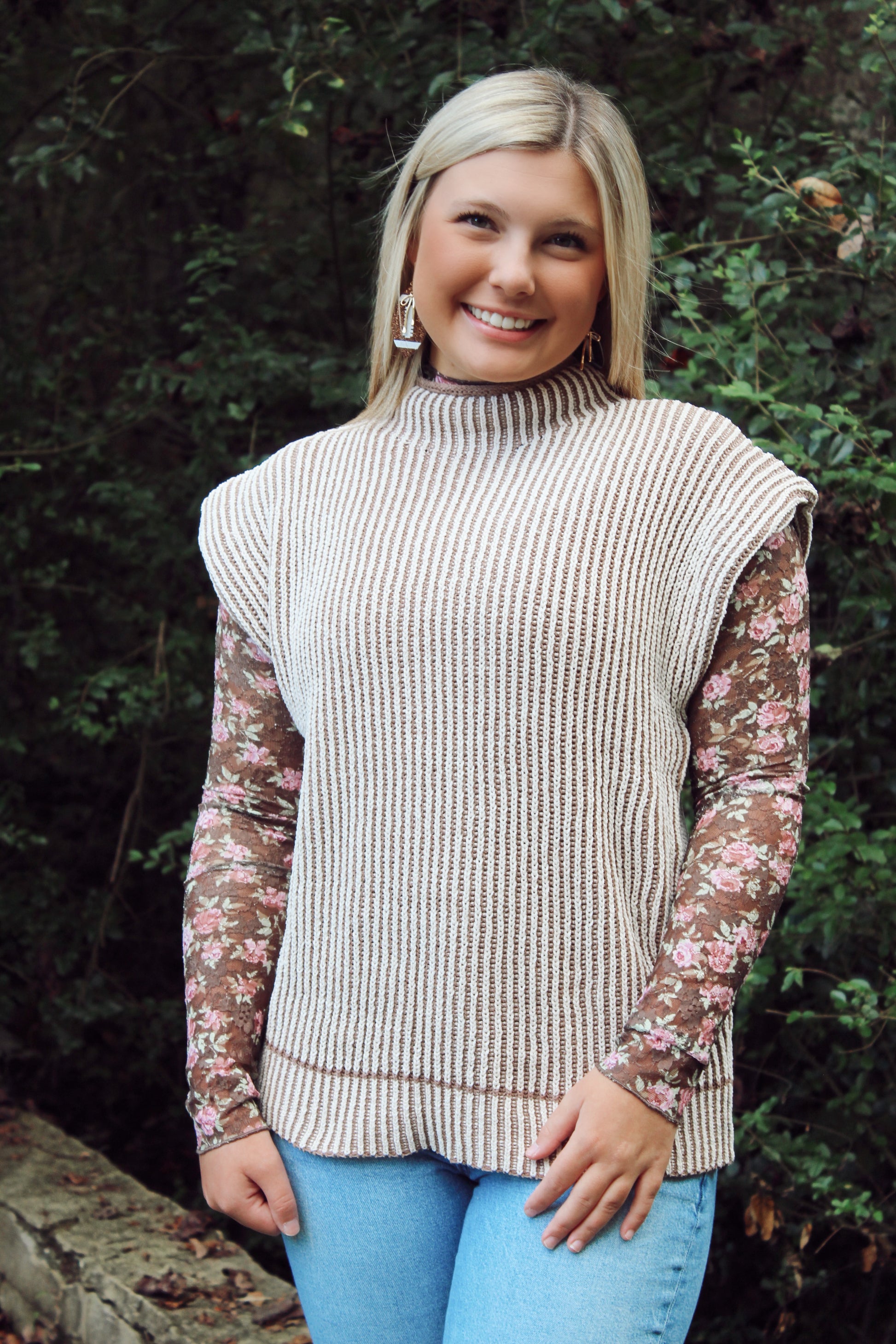 This sweater vest features a two-tone ribbed knit design, a mock neck, and a sleeveless cut. We paired this with our "Chocolate Floral Fitted Mesh Lace Top" for underneath to give it a pop! Wowza!!